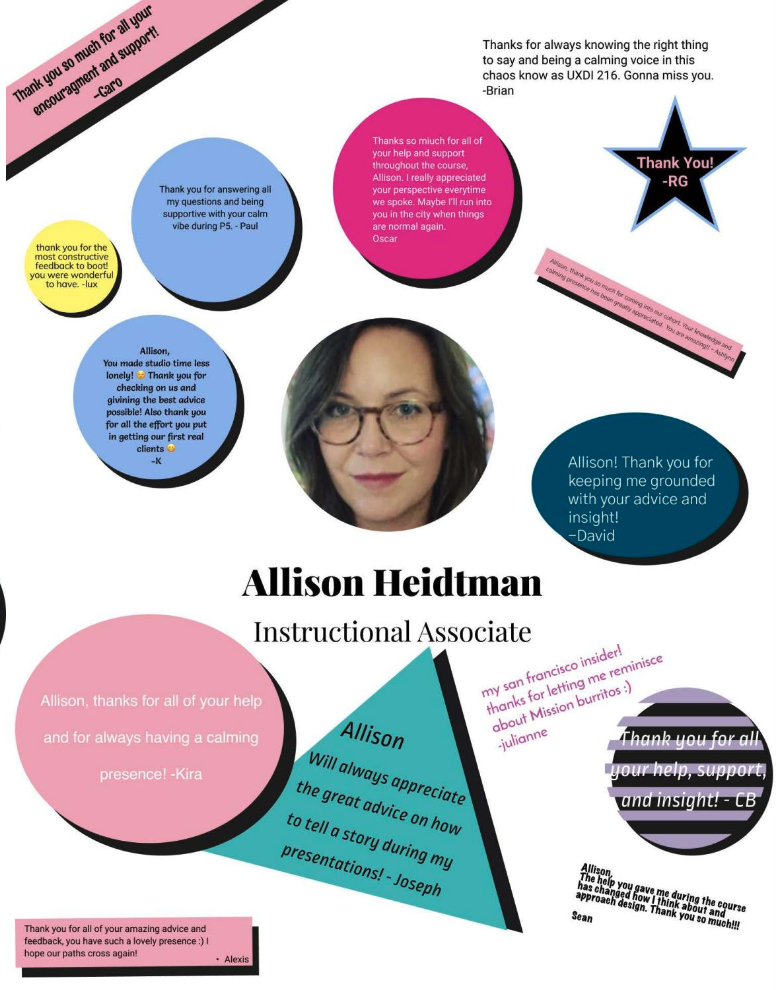 “Allison has given me the best and most in-depth feedback of my project so far and I really appreciate the time she takes to think deeply and make thoughtful comments to help make the project better.”